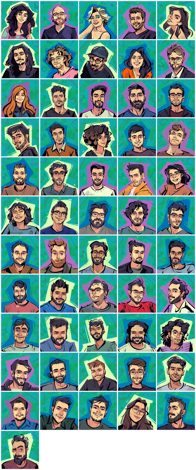Teammate portraits I made during my time at Digital Sun Games — uniform color for the website, custom colors for Slack.